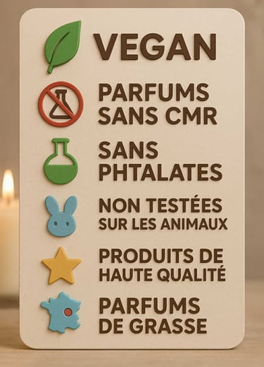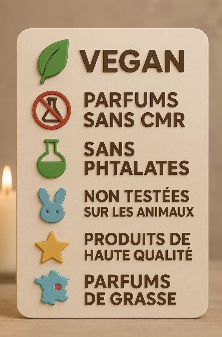 Nos bougies sont véganes, sans CMR et sans phtalates, garantissant une combustion saine, propre et respectueuse de l’environnement.